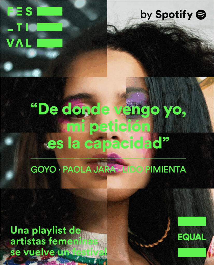 Spotify’s EQUAL Festival in Colombia brought together female artists to celebrate and amplify women’s voices in music. The agency created a campaign that spotlighted those with the least visibility, turning them into the faces of the festival and giving unheard talent a stage of their own.